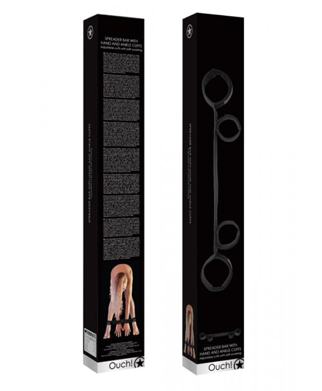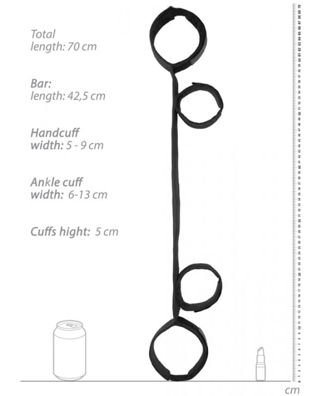 Spreaderbaren har ankel- og håndjern som er festet på en metallstang som måler 42,5 cm i lengden. Regner man med ankeljernet, blir stangen 70 cm lang. Her er det bare å spre beina for din kjære! Selve mansjettene, som brukes på hender og ankler, kan lett justeres takket være borrelåsen. Praktisk og behagelig! Med hender og føtter bundet kan du overgi deg til partneren eller ta over kontrollen selv.