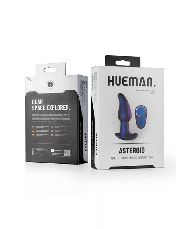 Asteroid kommer i en matt, litt ru boks mens pluggen er glatt og glinsende. Innvendig er alt pent pakket, og etter litt oppladning kan moroa begynne. Det er nødvendig å "varme opp" deg selv først med fingre eller et pluggsett som øker i størrelse, for Asteroid er ikke akkurat et lite leketøy. Når du har vært igjennom den fasen, kan det ekte moroa starte. Asteroid har veldig varierende stillinger og fjernkontrollen gjør at du enkelt kan bytte mellom stillingene uten å måtte trykke på knapper på selve apparatet. Det hele gir virkelig en herlig sensasjon som jeg kan anbefale til alle. Dog er leketøyene i Hueman-linjen ganske dyre. Jeg kjøpte derfor denne på tilbud, men det er absolutt prisen verdt!