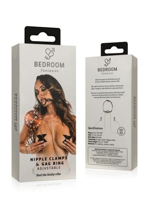 Dette Nipple Clamp & Gag Ring set fra Bedroom Fantasies er for deg som elsker kombinasjonen av makt, nytelse og sanselig underkastelse. Settet består av en rund silikonring som holdes på plass av en justerbar hode-rem, og to klyper som kobles til en lekker lenke for ekstra pirrende trykk mot brystvortene.