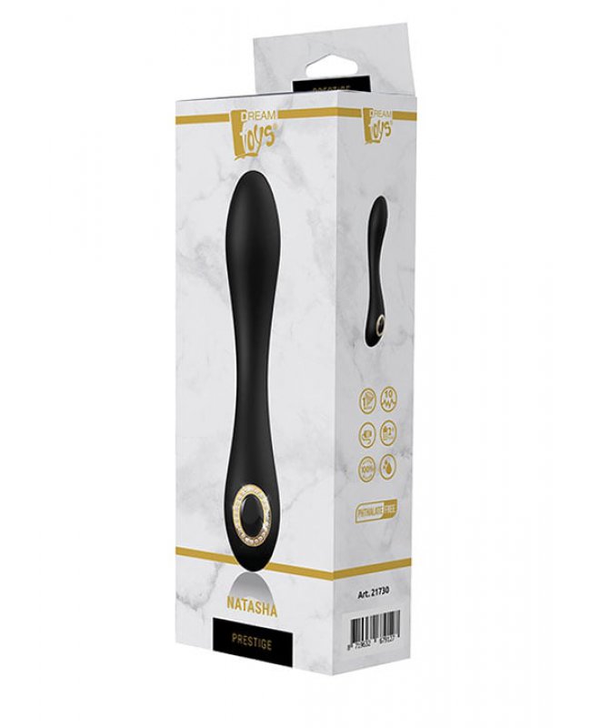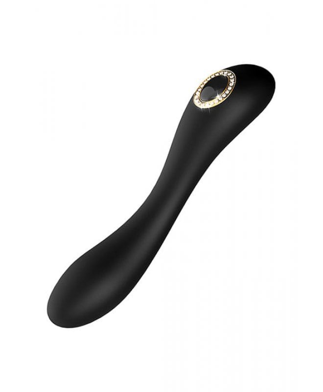 Dette er en fantastisk lekker vibrator som oser av luksus! Vibratorens ergonomiske form gjør at den glir på plass uten problem. Overflaten er luksuriøst silkemyk, og hele skaftet er mykt og fleksibelt, så den følger dine kurver perfekt. Den deilig utformingen kan også by på handsfree nytelse. Bare smett den på plass, og innsnevringen nederst sørger for at vibratoren blir sittende deilig på plass. I tillegg har den én knapp som med lekre diamantsteiner som lar deg trykke deg gjennom 10 deilige vibrasjonsmodus.