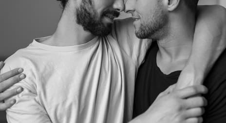Jeg slipper ham ned og leder ham inn på soverommet. Vi kysser intenst mens klærne faller én etter én. Skjorter og sko forsvinner i gangen, bukser sparkes av på vei inn, og sokkene rives av i farten. Til slutt står vi kun i boksere, pustende og kåte. Han tar tak i min og drar den ned.