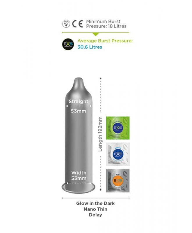EXS Nano Thin er et rett kondom og kommer i standardstørrelse på 53 mm bredde.