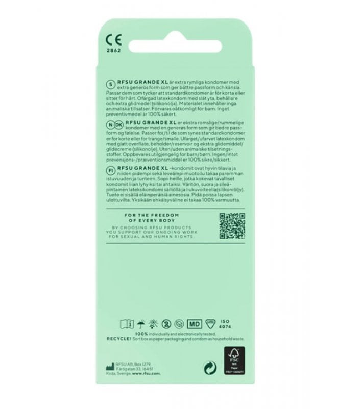 Kondomen er tynn og enkel å rulle på. Den har en generøs passform og er både bredere og lengre enn "standard-fit". RFSU sine kondomer er sikre, enkle og nøytrale på lukt.