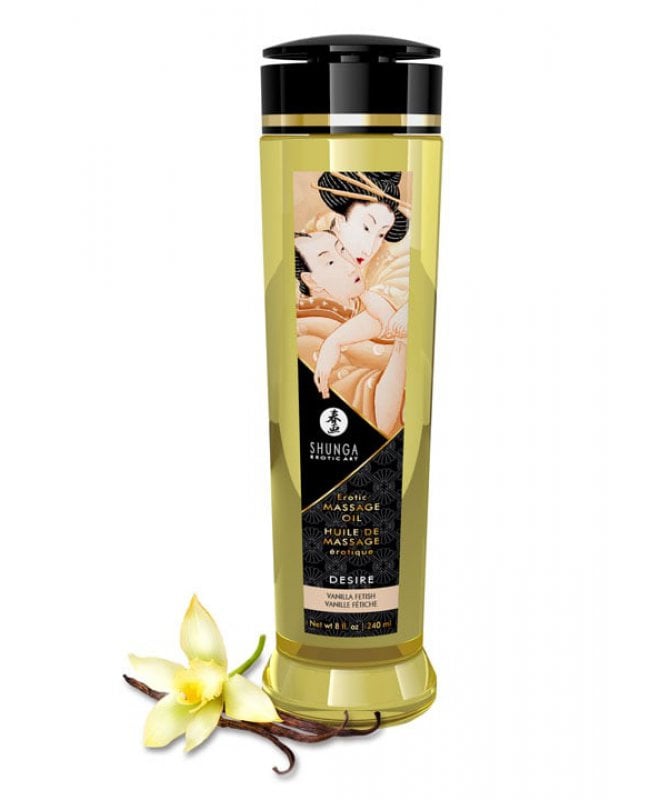 Nyt følelsen av å gi eller få sensuell, erotisk massasje med en eksklusiv kaldpresset massasjeolje. Velg en av de eksotiske duftene som vil gi deg en følelse av velbehag og erotikk. Denne oljen fra Shunga dufter av sensuell vanilje, og har dermed fått navnet "Desire".