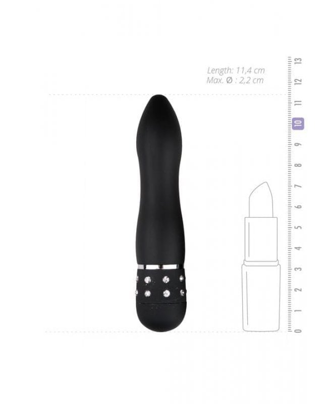 Denne vibratoren er for vaginal stimulering, og har et unikt design med stimulerende buede former langs skaftet, og små diamantstener ved roten. Ved å bruke vribasert vibrasjonskontroll, kan du gå fra milde kjærtegn til dype massasjer... Minivibratorens faste og glatte materiale gir en deilig følelse, gjør innsettingen enkel, og den spisse tuppen er et utmerket verktøy for nøyaktig stimulering. Diamanter er en jentes beste venn, og det samme er denne søte, lille vibratoren!
