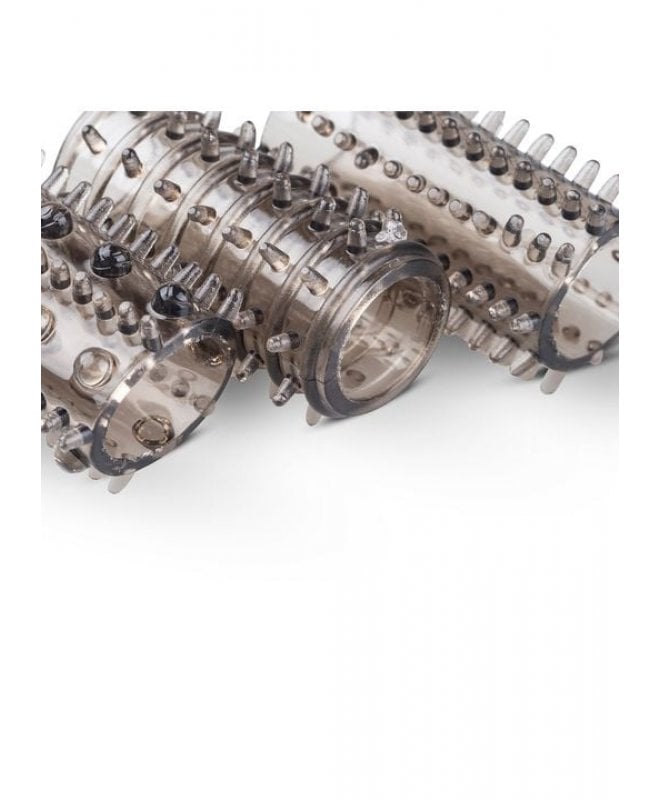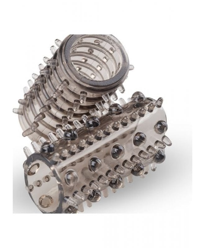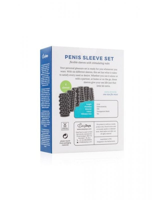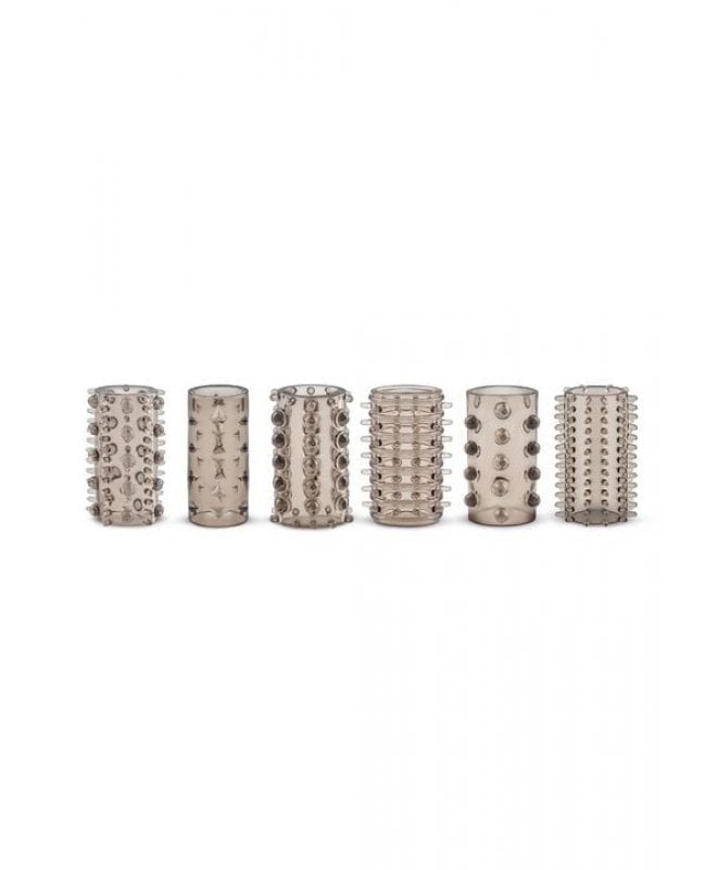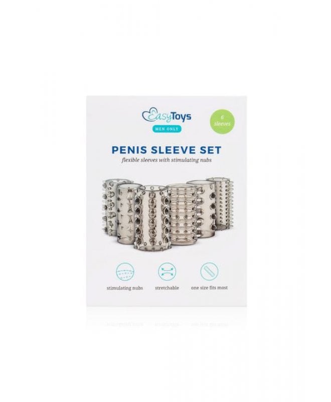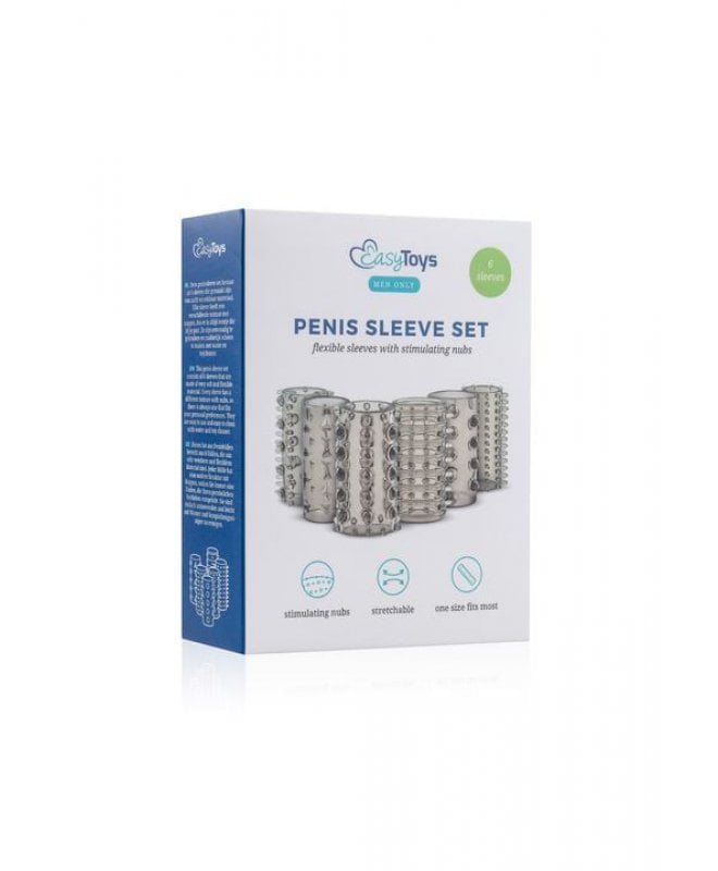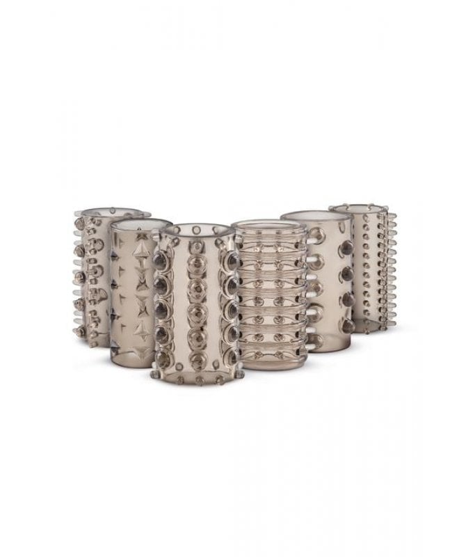 Disse penishylsene er laget for å stimulere partneren din ytterligere. Velg mellom 6 forskjellige sleeves, med ulike teksturer av riller og nupper, og tre hylsen rundt penis. Ved penetrering vil partneren din få mer nytelse av den stimulerende teksturen på sleeven, noe som også gir penis mer volum. Du kan sette sleevene på dildoer, vibratorer eller andre sexleketøy for ekstra krydder under penetreringen. Penishylsen bør kun brukes til vaginal penetrering, og skal ikke brukes analt da sleeven kan gli av. Materialet på penishylsene er elastiske for en god passform, og er enkle å rengjøre.