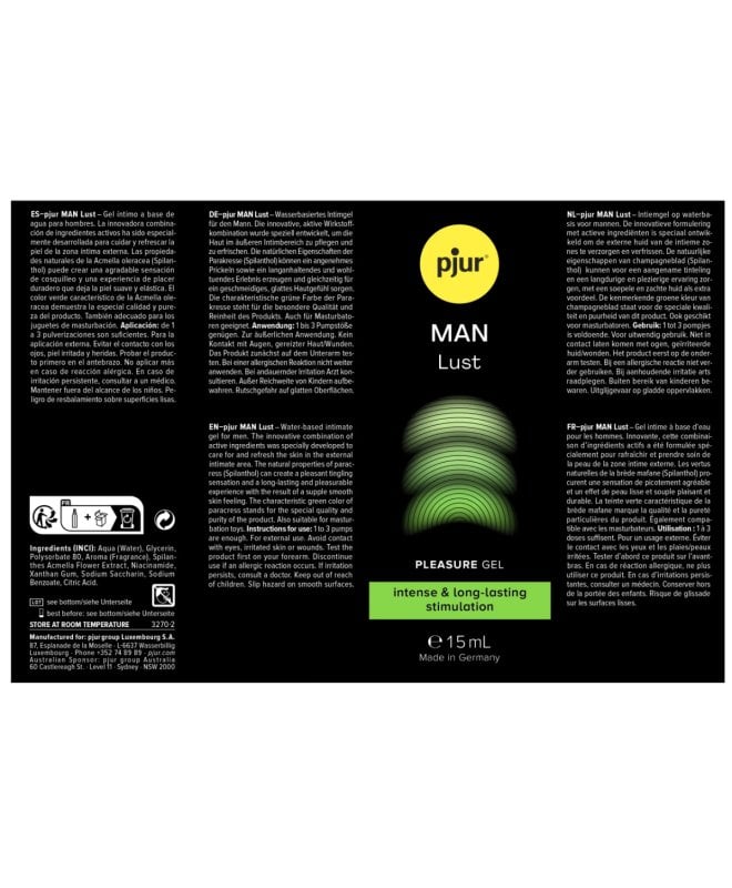 Naturens egen pirring Det som gjør Pjur MAN Lust så spesiell, er bruken av naturlig Spilanthol. Dette er en planteingrediens kjent for sin evne til å skape en aktiv og oppfriskende følelse på huden. Gelen er lett, trekker ikke inn med en gang, og føles aldri klissete. I tillegg inneholder den pleiende komponenter som sørger for at huden i intimområdet holder seg myk og velpleid.
