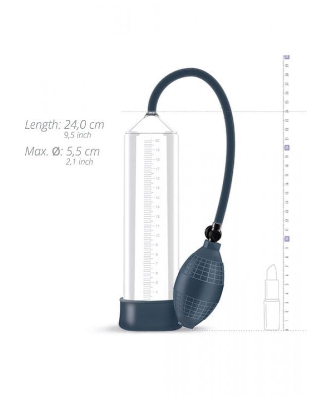 En veldig fin kvalitetspump for penis. Skjeden er veldig fleksibel men vanskelig å få på med ereksjon. Den er ganske stiv noe som sikrer at du får god tilkobling med en gang. Heldigvis er skjeden veldig lett å ta av røret. Jeg strekker skjeden godt og skyver den rundt kjønnsdelene mine. Etter det er røret veldig lett å feste igjen til skjeden. Så snart du begynner å pumpe lager røret vakuum med en gang. Små pumper har allerede stor effekt. Knappen på balgen fjerner vakuumet umiddelbart slik at det hele kan betjenes med en hånd. Linjalen på siden gir morsom muligheter. Veldig fin og morsom å bruke sammen og nytelseverdien er veldig høy.
