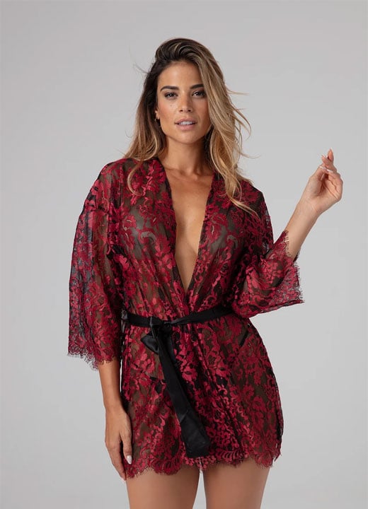 Denne røde kimonoen fra Christine le Duc er laget i myk, gjennomsiktig blonder med frynsete kanter, og kommer med matchende stringtruse. Modellen er løs og lett på kroppen, og knyttes enkelt i livet.