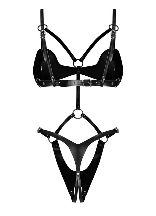 Flere justerbare stropper lar deg tilpasse passformen slik at den sitter helt riktig, mens metalldetaljene gir et rått blikkfang uten å bli for mye. Det åpne skrittet gir plagget en tydelig, leken vri som gjør intensjonen ganske klar.