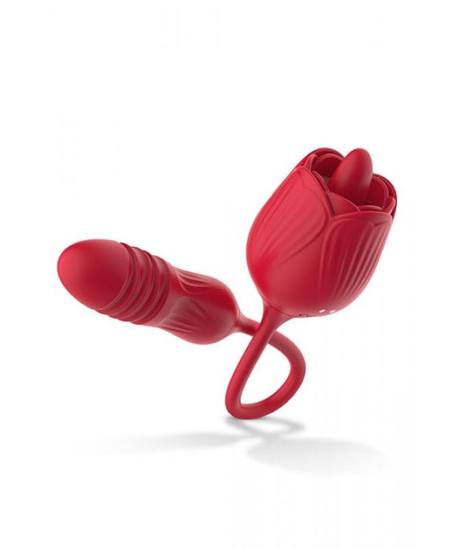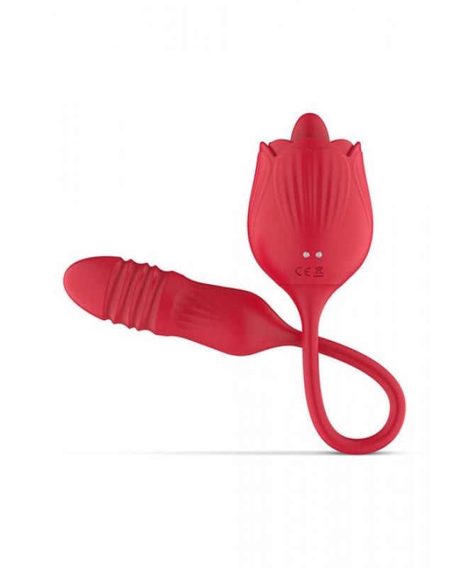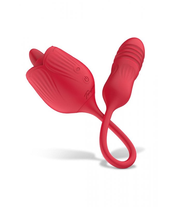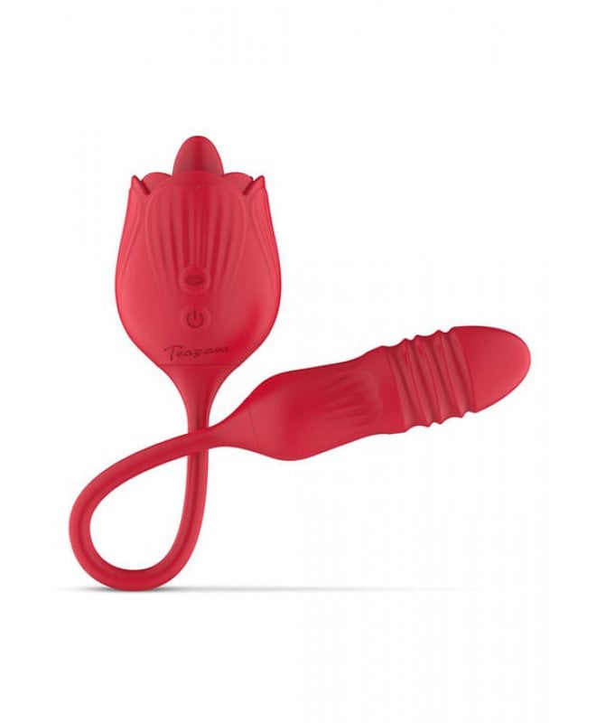 Denne slikkemaskinen fra Teazers kombinerer alt du vil elske! Den har en pirrende tunge for slikking og en pulserende dildo som kan brukes både vaginalt og analt. Bak det søte rosedesignet skjuler det seg kraftige orgasmer som vil gi deg frysninger.