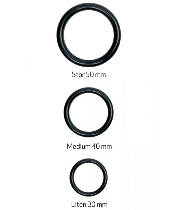 Tre O-ringer følger med, slik at du også kan benytte dildoer i andre størrelser sammen med strap-on-beltet. Ringene er i silikon, og i størrelsene large, medium og small.