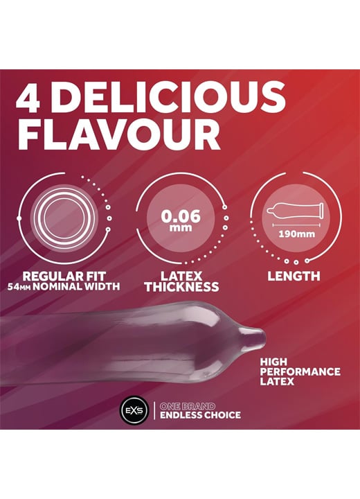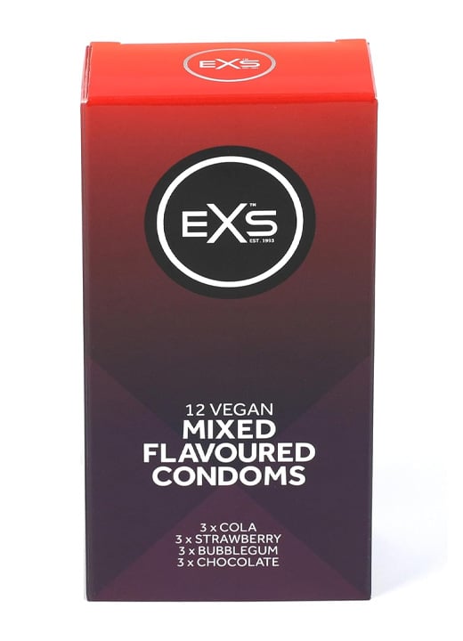 Kondomer med smak er en av bestselgerne våre. EXS Mixed flavour 12 pk kondomer inneholder smakene cola, jordbæris, sjokolade og tyggegummi.