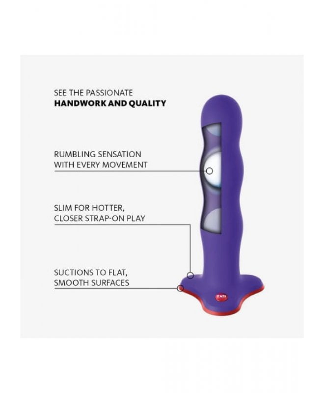 Oppdag Bouncer fra Fun – en innovativ dildo med tre vektede kuler som hopper og ruller inni skaftet når du beveger den. Denne unike funksjonen gir en dypere og mer organisk følelse enn vanlig vibrasjon. Perfekt for både solo- og parlek, kan Bouncer brukes alene, med en partner eller som strap-on, takket være den tynne basen som lar deg komme nærmere under selelek.
