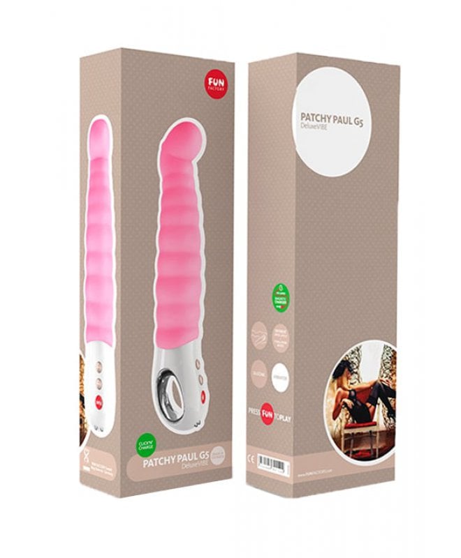 G5 Patchy Paul er en stor og imponerende vibrator fra Fun Factory med alt man måtte ønske seg av et sexleketøy. Vibratoren er kraftig, med jevn fordeling av vibrasjon i hele skaftet. Vibratoren er laget i silkeglatt silikon, og skaftet er fleksibelt, men fast - slik at man kan legge press mot g-punktet. Den lille bøyen i enden av skaftet gjør det enklere å treffe g-punktet, men gjør også vibratoren perfekt til å bruke på andre erogene soner. Denne vibrerende herligheten er perfekt tilpasset kvinnens anatomi, og lar henne seile på orgasmebølgen i det uendelige.