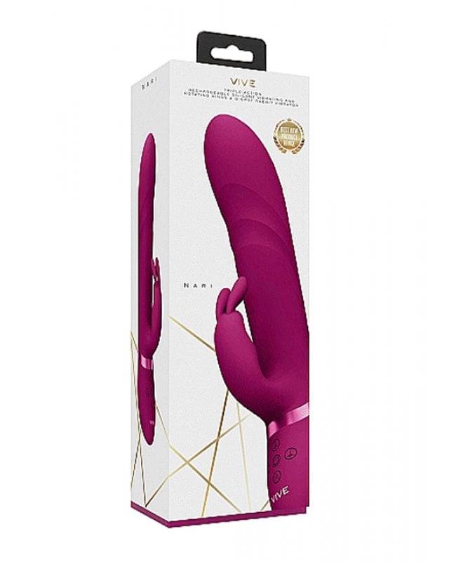 Nari er en av de kraftigste og mest innovative rabbitene som Vive har, og takket være dens unike funksjoner blir den elsket av Vive's kunder. Rabbitvibratoren kommer i en solid og stor størrelse som gir deg kraftige og rumlende vibrasjoner. Det unike med denne er at den har roterende kuler på innsiden av skaftet som gir en helt annerledes og deilig stimulering i skjeden. Kulene på innsiden roterer og beveger seg oppover, og dette vil føles helt fantastisk i kombinasjon med de andre funksjonene den har! Stimuleringen mot g-punktet, klitoris og skjeden vil gi deg orgasmer du ikke har kjent maken til før.