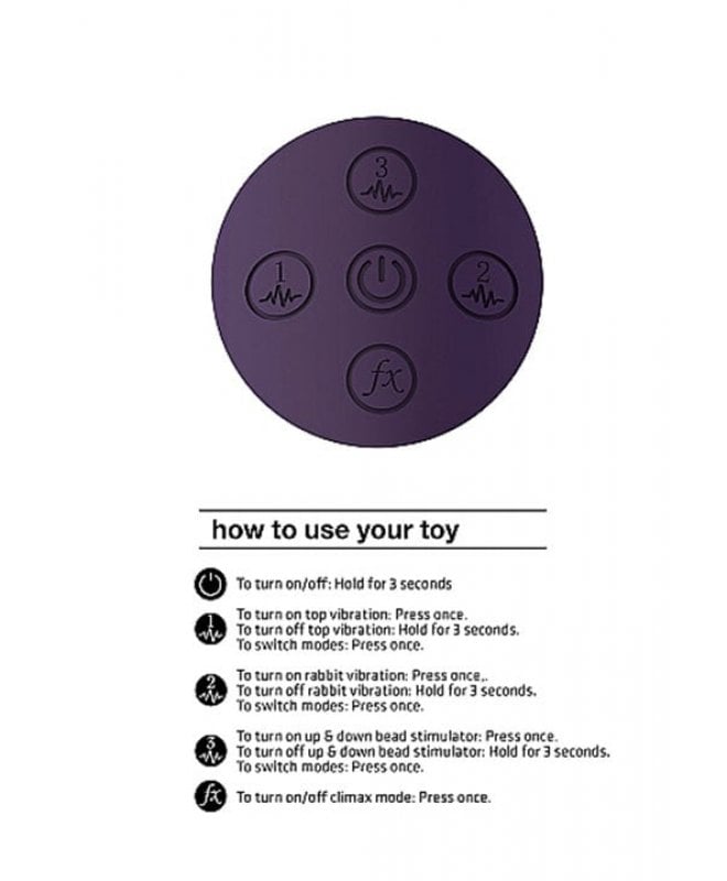 Om du vil ha enda mer fart i sakene, så kan du glede deg over enda to kraftige motorer i rabbitvibratoren. Du finner hele 10 lekne vibrasjonsmodus i både klitorisvibratoren og på tuppen av skaftet. Den bevegelige ringen, vibrasjonen i tuppen og den herlige kaninen kontrolleres enkelt, og helt uavhengig av hverandre, så her kan du virkelig få skreddersydd nytelse! Du kontrollerer hver enkelt av de tre motorenes 10 forskjellige modus, med hver sin knapp i bunnen på rabbitvibratorens håndtak. Hold knappen inne i ett sekund for å starte, og i tre sekunder for å stoppe. Bytt modus med et enkelt klikk på knappen.